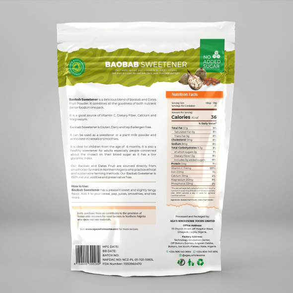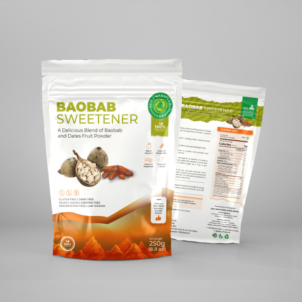 Baobab sugar is a mix of Baobab and Dates Fruit Powder. It can be used as a sweetener or a milk replacement and is rich in Vitamin C and Calcium