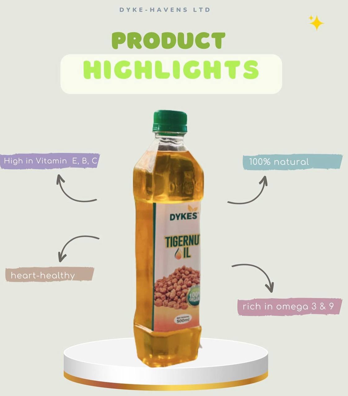 Tigernut Oil is a versatile/all-purpose oil that has a rich nutty taste, It contains high amounts of Vitamin E, Oleic Acid, and good cholesterol for the heart. It is a powerful antioxidant that boosts fertility, and also has anti-aging properties. It can be used for deep frying as It has a high smoke point of 238 degrees centigrade.
